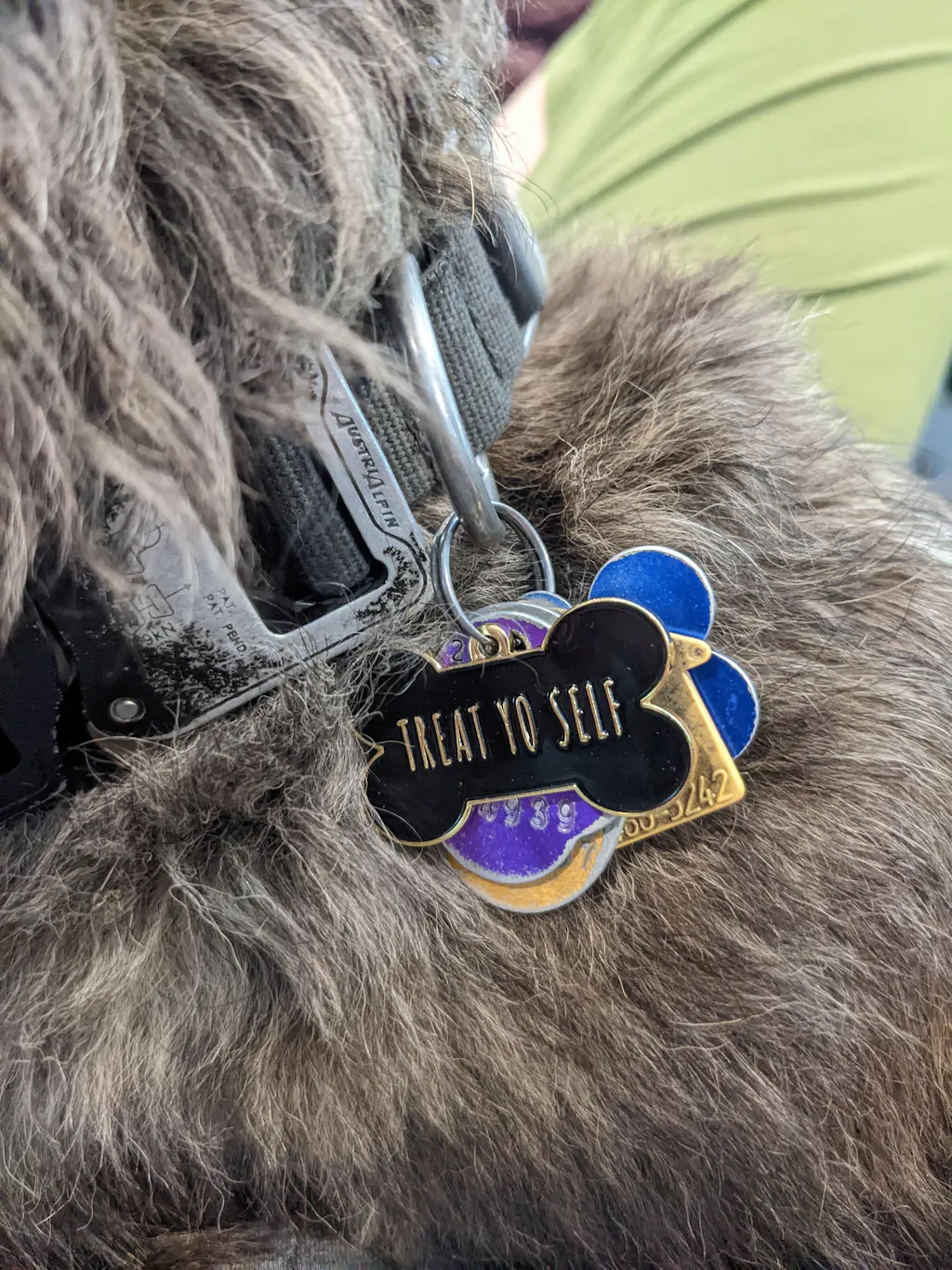 In the name of retail therapy, a piece of chocolate, and a good facial, treat yo’ self to a little style with this ‘Treat Yo Self’ Pet ID Tag in black. Your pup is so good. They wait for you all day. They sit for treats. They cry when Mufasa dies. They’re such good boys and girls. Treat them! And give yourself a treat too for being such a good dog mama. Treats for everyone with the ‘Treat Yo Self’ Pet ID Tag in black.